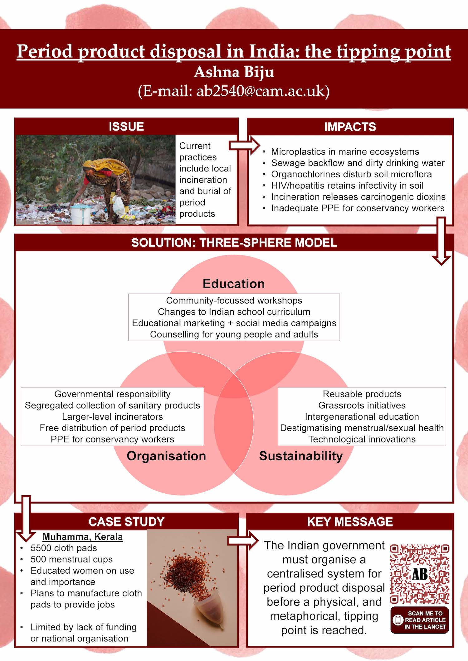 Ashna is a sixth-year medical student at the University of Cambridge. She is a deaf woman of colour and is a passionate advocate against health inequalities and discrimination. Ashna is interested in global health and menstrual health and she wrote a paper on unsafe period product disposal proposing a three-sphere model to develop long term solutions, which was successfully published in the Lancet. In the future, Ashna hopes to pursue a clinical career in public health or women’s health (or both!) alongside academic research.