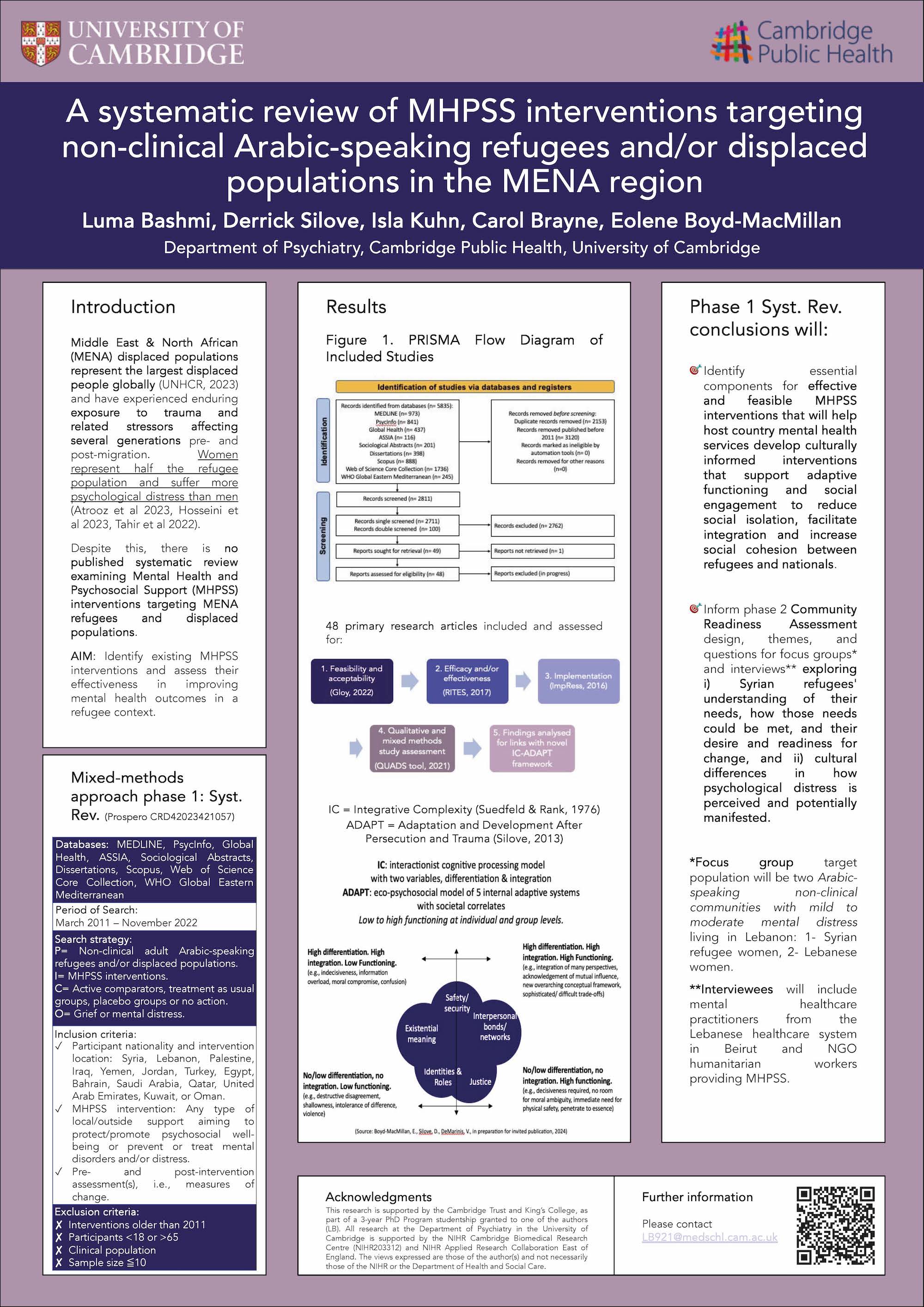 Luma Bashmi, MA is in her second year of doctoral candidacy in the Department of Psychiatry and Cambridge Public Health at the University of Cambridge. She is focusing on mental health and wellbeing among Syrian refugees in Lebanon by applying the IC-ADAPT framework, and looking more widely at mental health in the Middle East & North Africa (MENA) region.