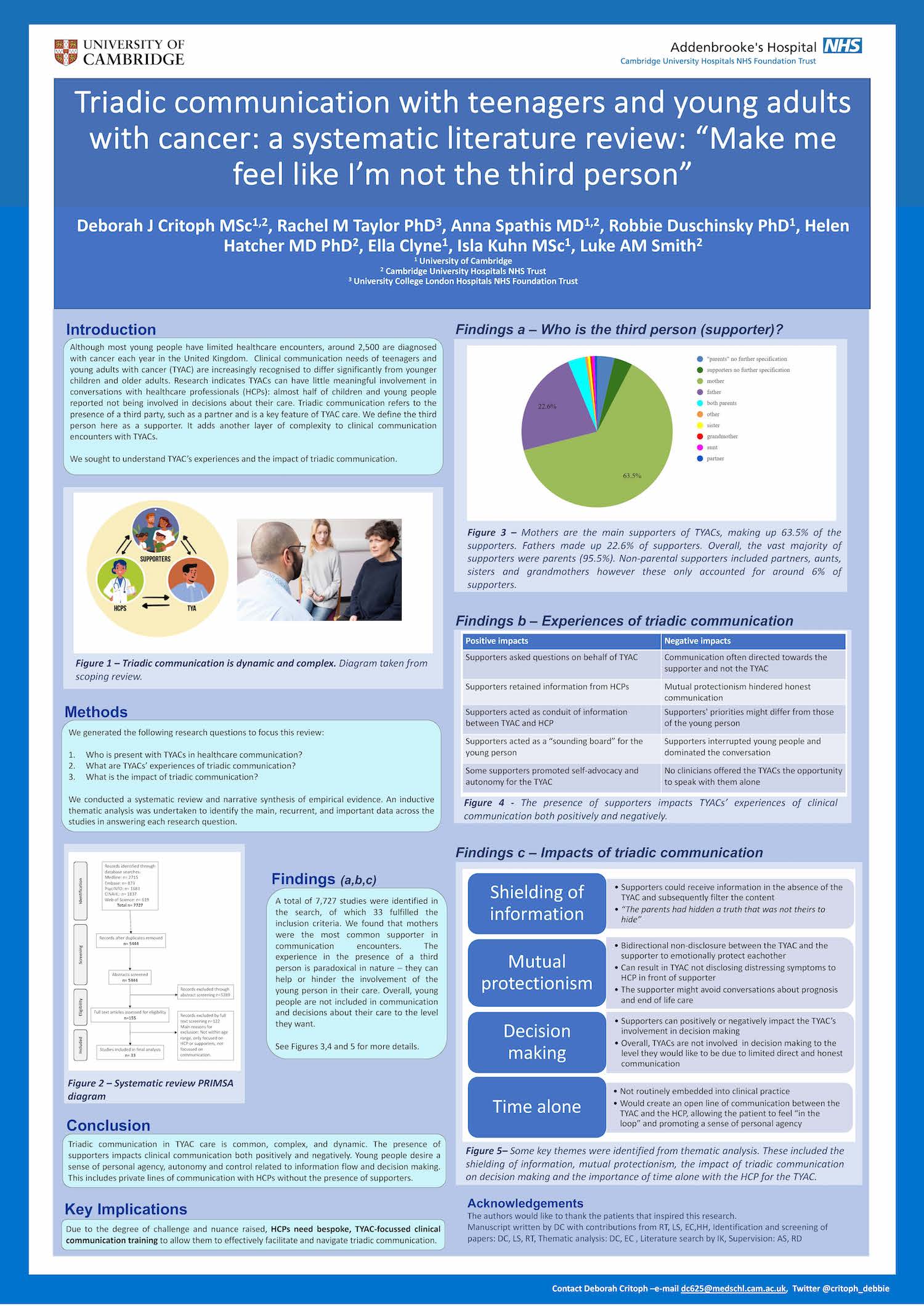 Deborah is now combining these two areas of specialist interest, clinical communication and TYAC, to research how we can communicate effectively with teenagers and young adults with cancer. She will be researching the perspectives of healthcare professionals, young people and parents to understand the interactional dynamics and to ultimately develop a training intervention to educate healthcare professionals to communicate effectively with TYAC.