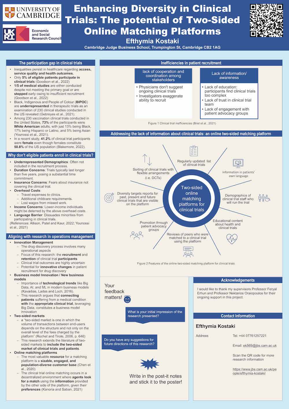 Efthymia is a PhD student in Healthcare Operations Management at the Judge Business School. She is passionate about research that addresses deeply rooted inequalities including but not limited to gender, race, and ethnicity. As part of her first research project, she wants to delienate the role of platforms in the matching of patients with clinical trials.