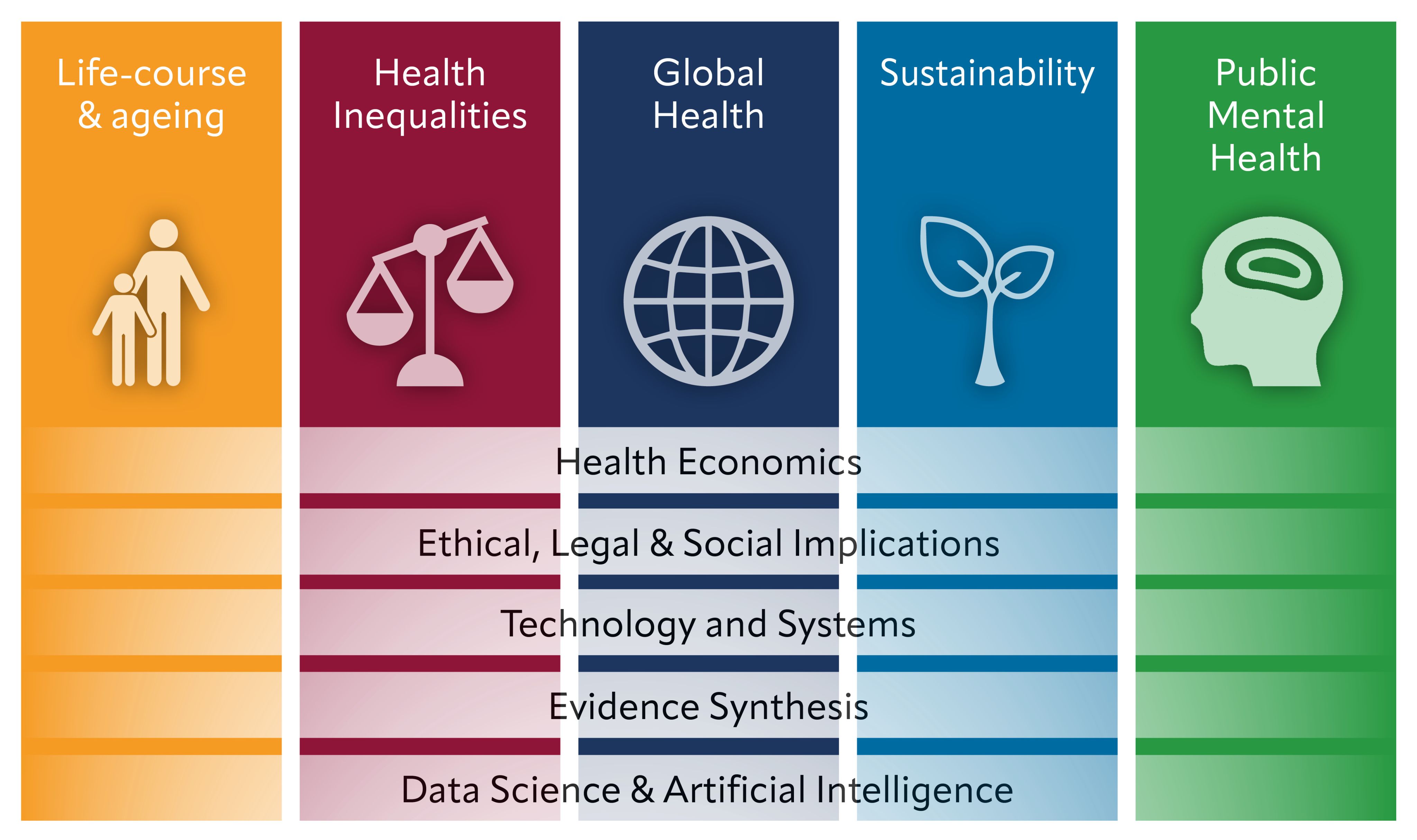 The centre’s activities are structured around five public health research pillars, led by researchers at different career stages: Life-course and Ageing, Health Inequalities, Global Health, Sustainability and Public Mental Health. Five further cross-cutting themes offer different approaches to examining the pillars and support the many intersections of interdisciplinarity.